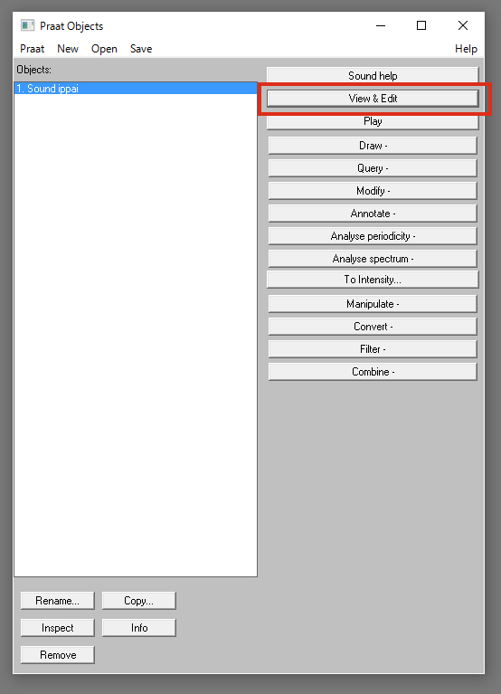 4. Pilihlah dari daftar yang ada dalam「Praat Objects」, lalu klik「View & Edit」